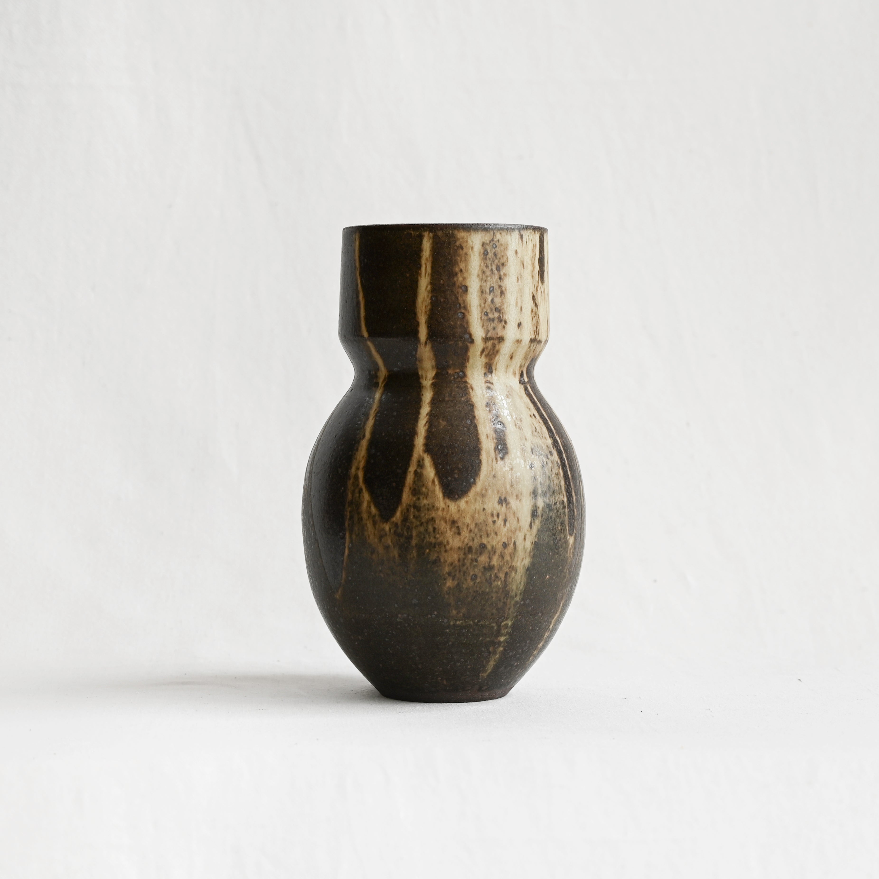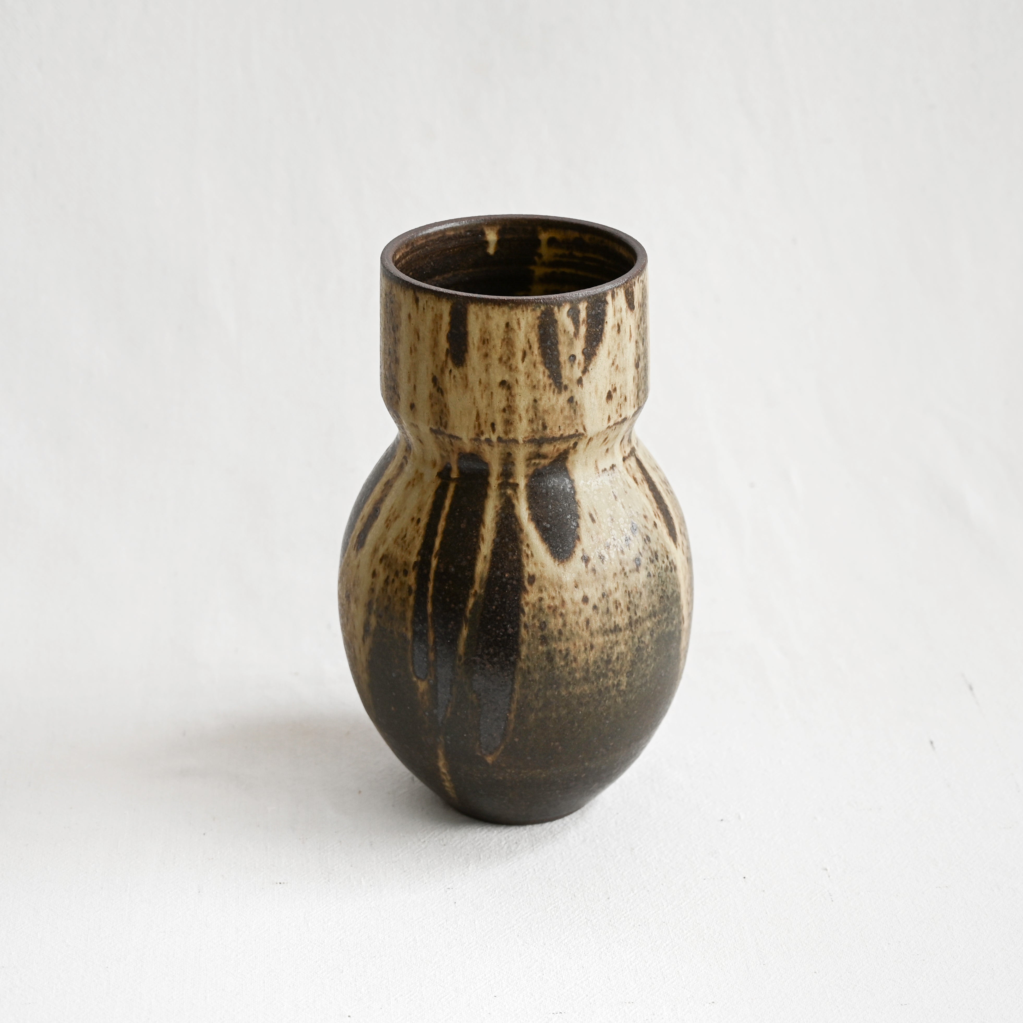 Expertly thrown, this Flora stoneware vase holds an elegant, elongated shape, ideal for longer stems or freshly cut branches. Handmade in California, this piece is a modern take on a classic, minimalist vessel in a rustic yet refined variegated brown glaze.
