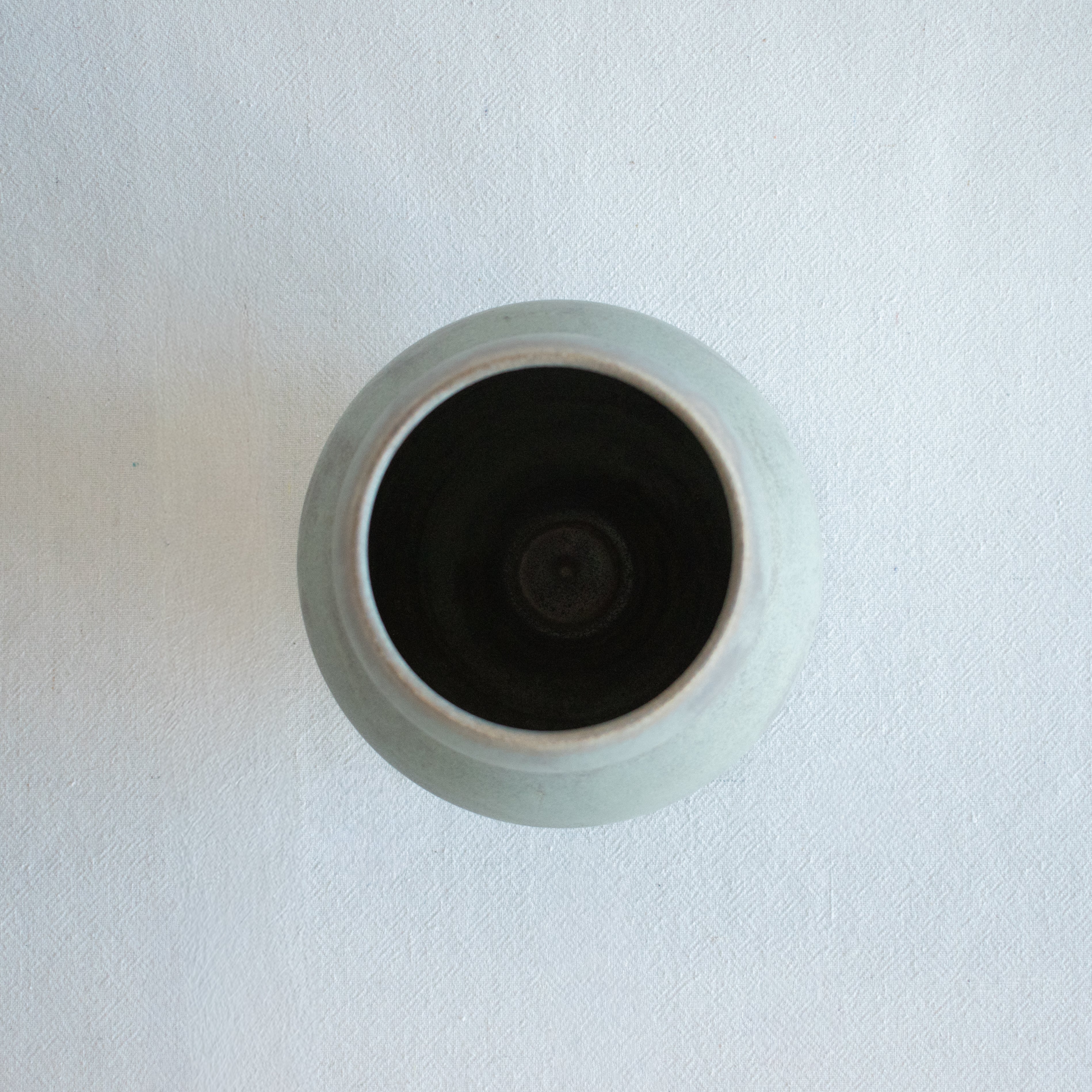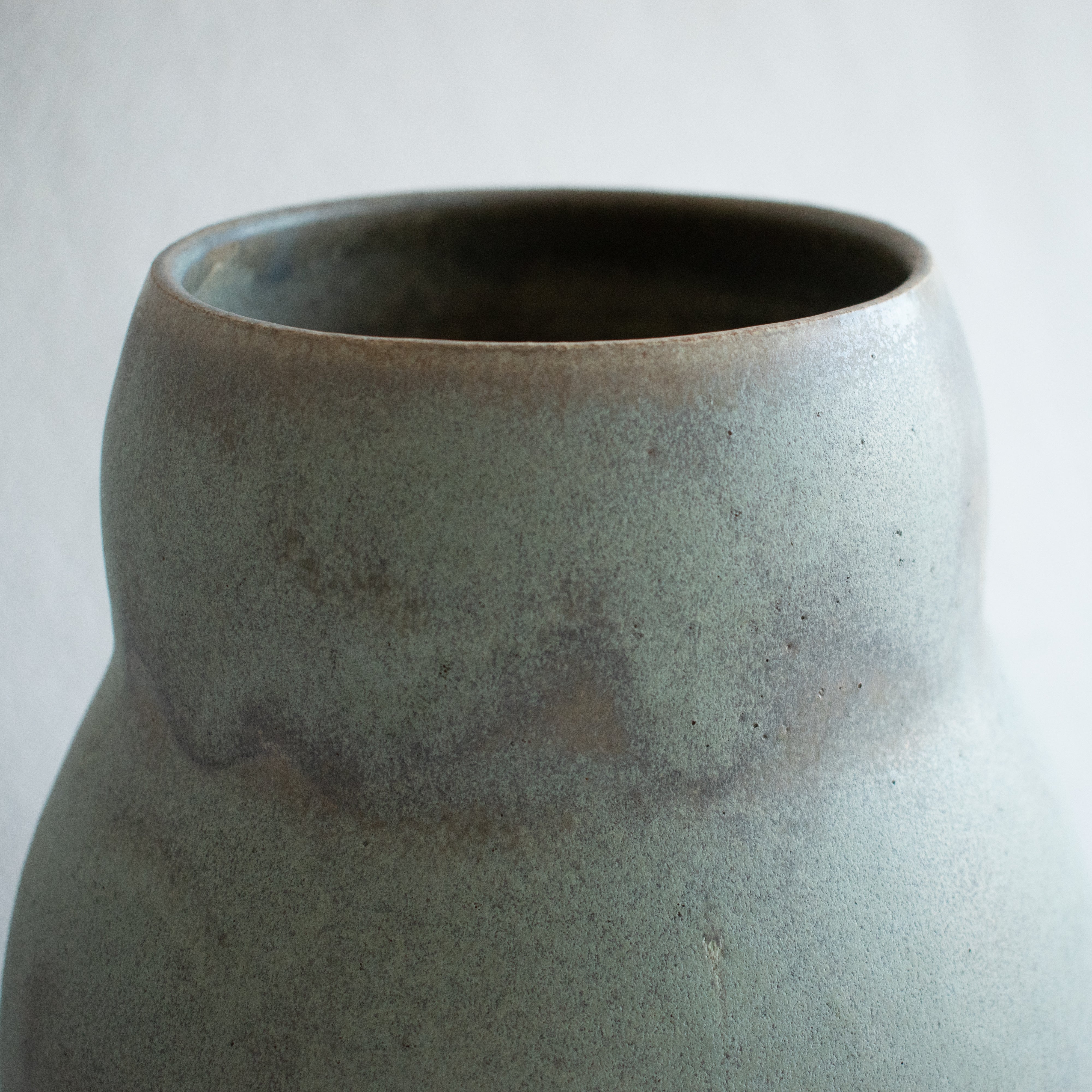 Handmade in California, this stoneware vase has a playful-yet-elegant shape, drawing inspiration from the organic curves of a gourd. Offered in a refined mineral green finish with blue and grey undertones. A beautiful addition to any collection.