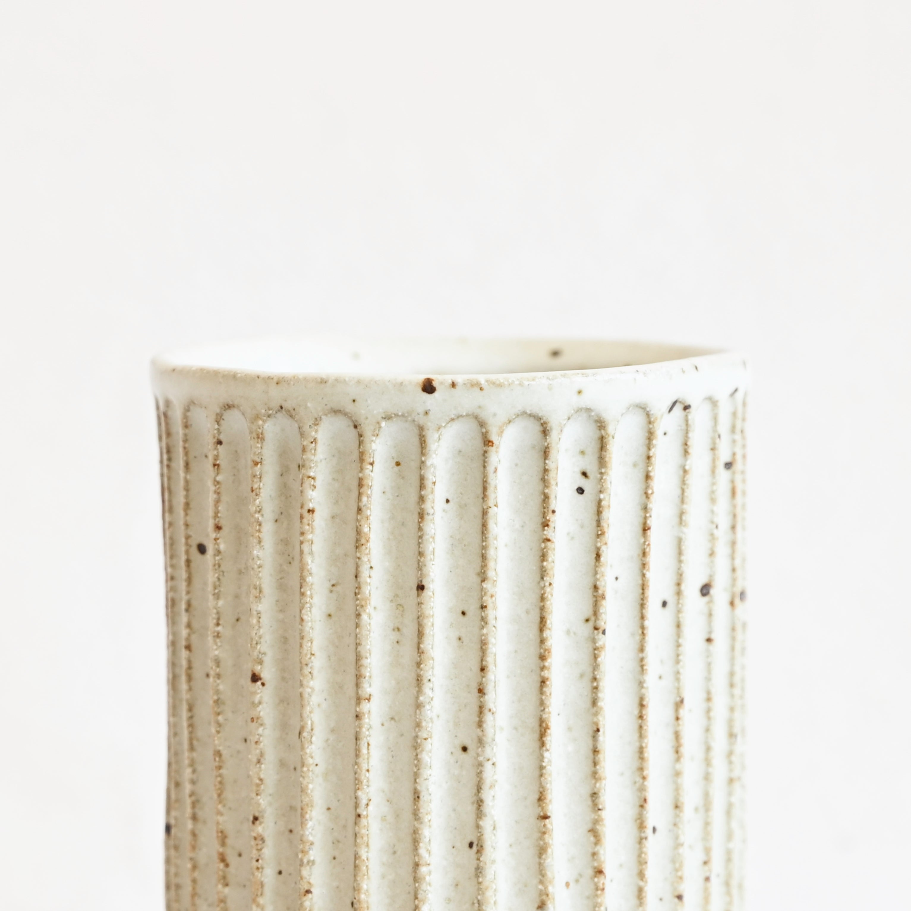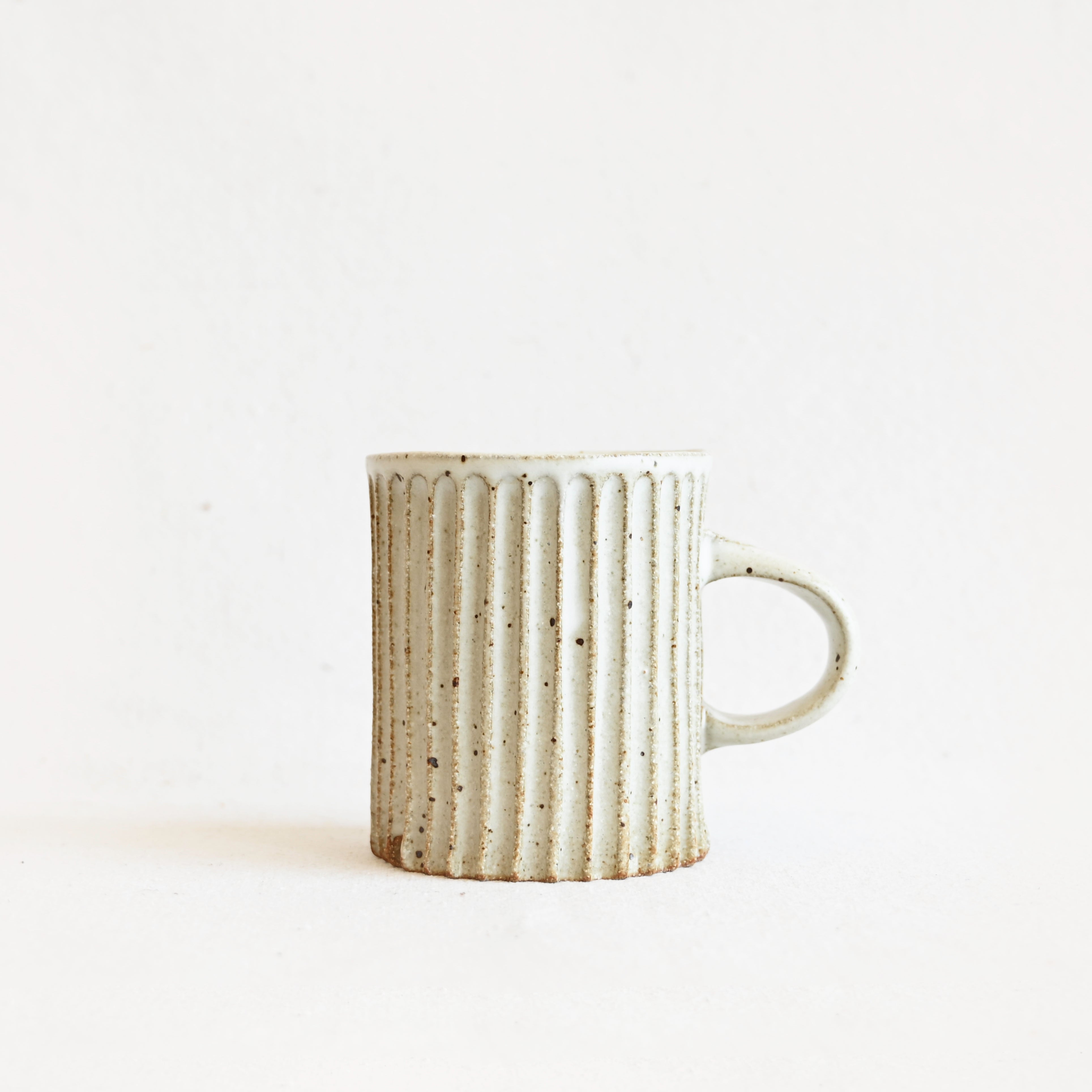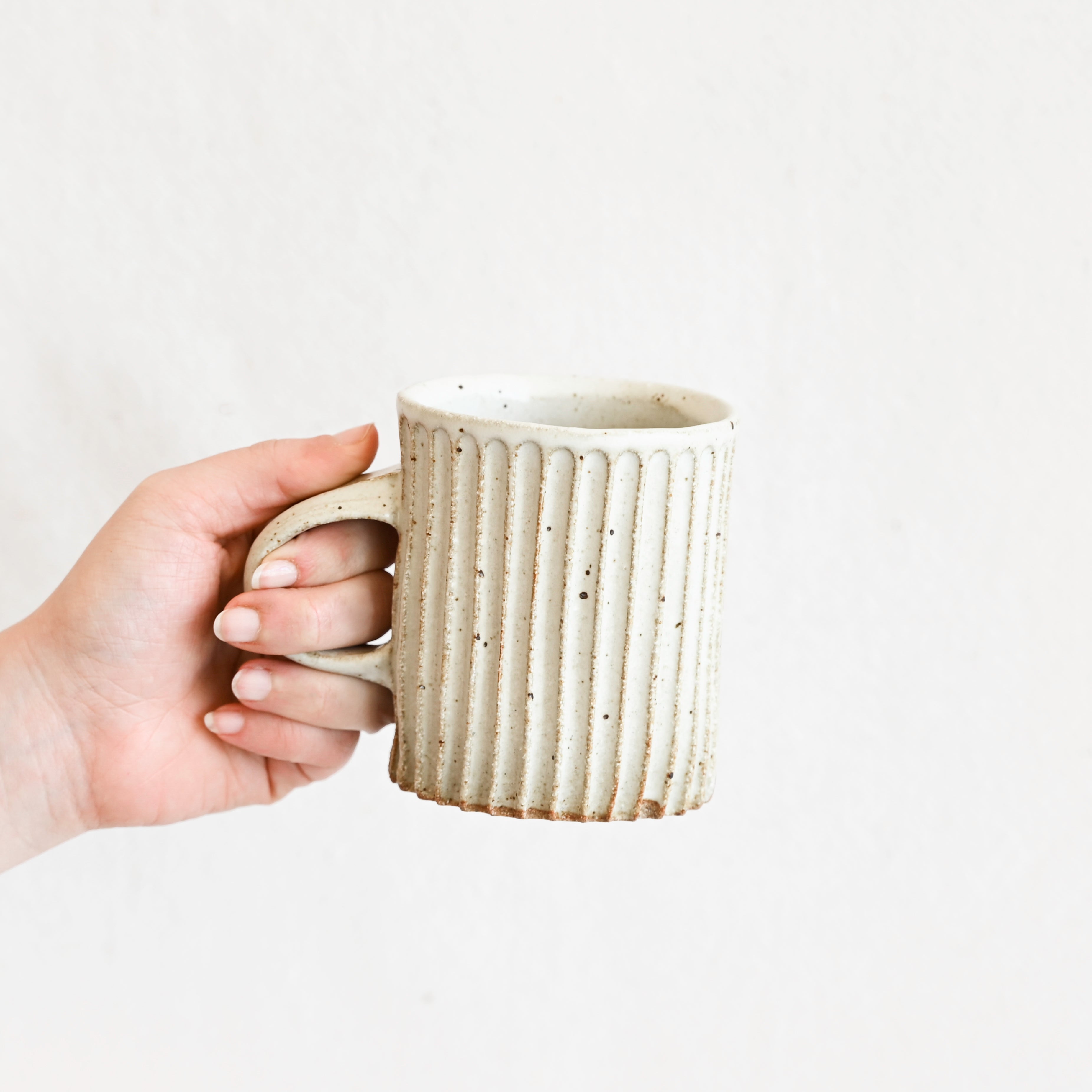 These hand-formed and carved stoneware mugs are handmade in Los Angeles by ceramicist Beth Katz of Mt. Washington Pottery. Beautiful and tactile, they have a soft matte white speckled glaze and are available in two different carving styles, Column and Facet. Column is characterized by slim carvings, while Facet is made of wider vertical ridges.