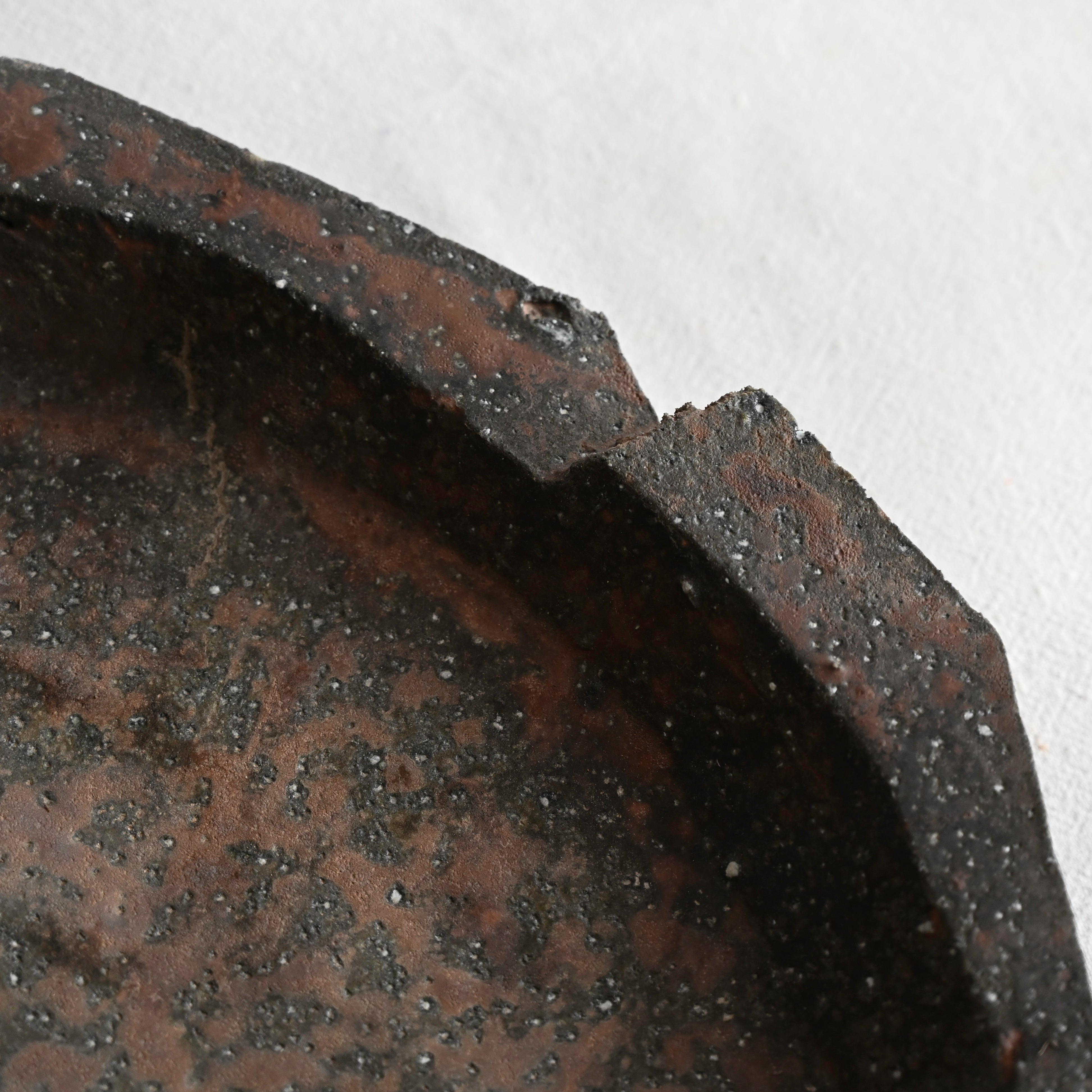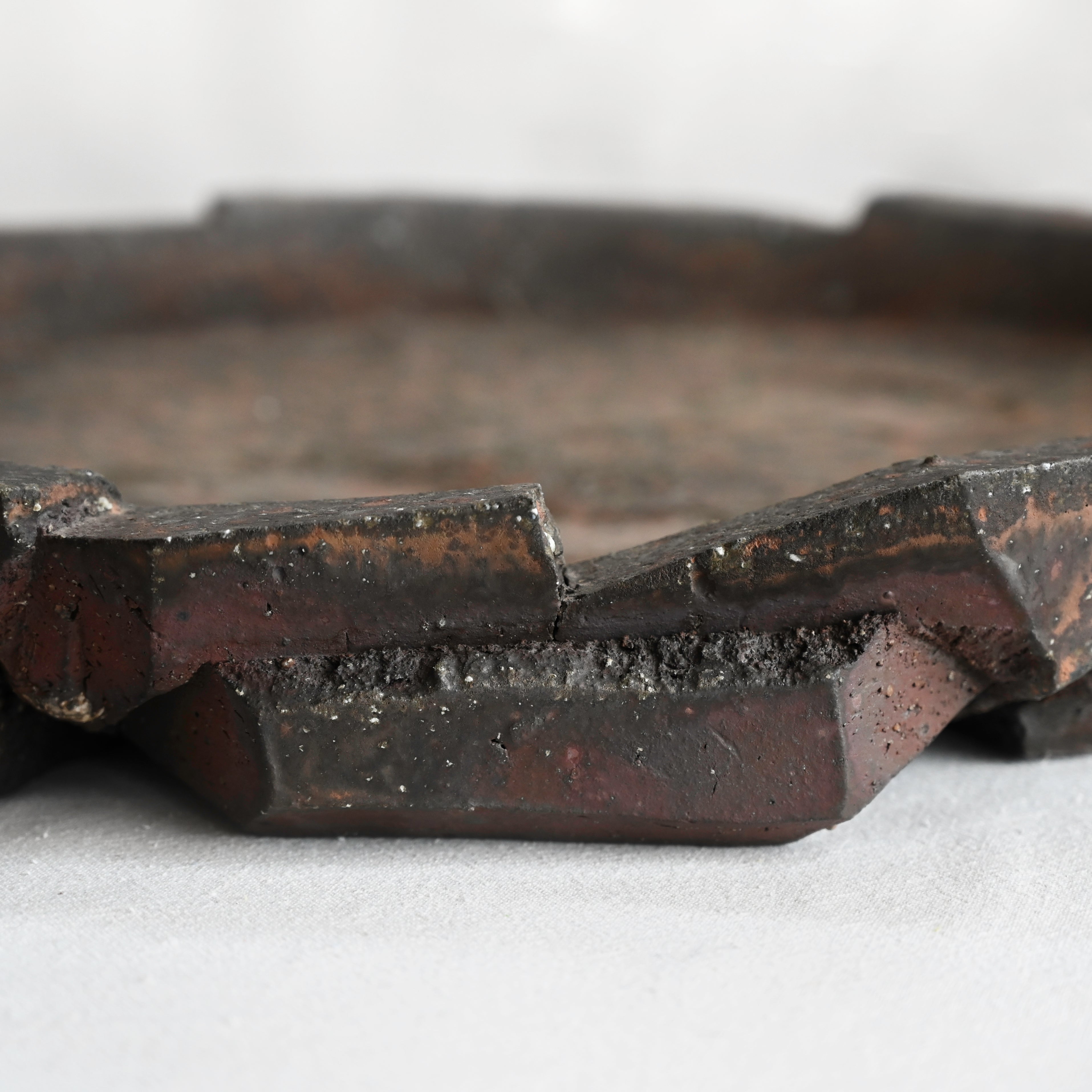 Cross was immediately drawn to the ancient process of wood-firing, which gives each piece a patina that evokes ancient artifacts, old stone structures or discarded post-apocalyptic future relics. His vessels suggest simple minimalism, evoking geology, science fiction and modern art. His sculptural pieces, bold and primitive in their forms, combine a modern sensibility with textural materiality. His printmaking background also remains evident in his pieces, which favor strong silhouettes, hard edge lines and repetitive leitmotif.