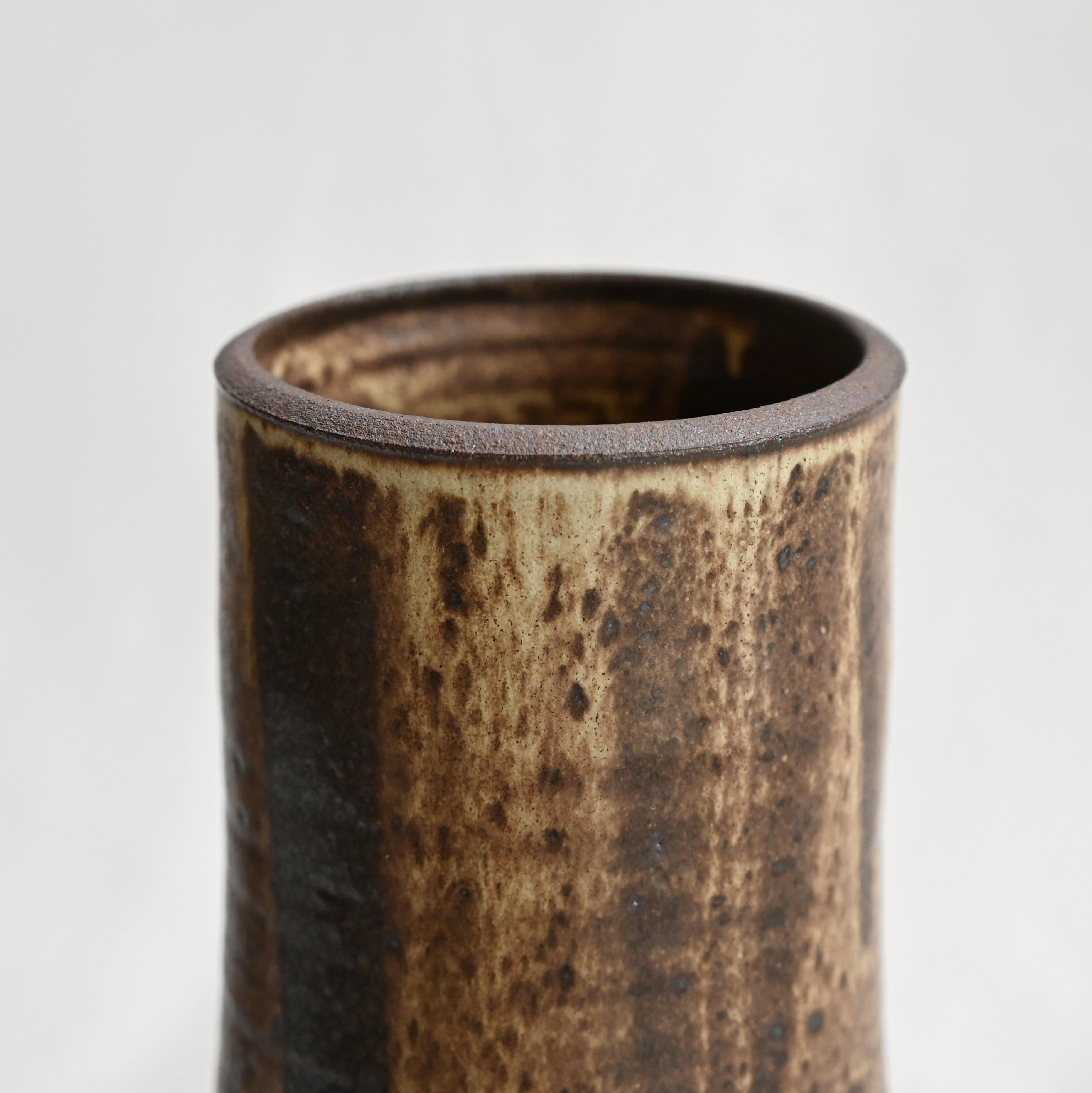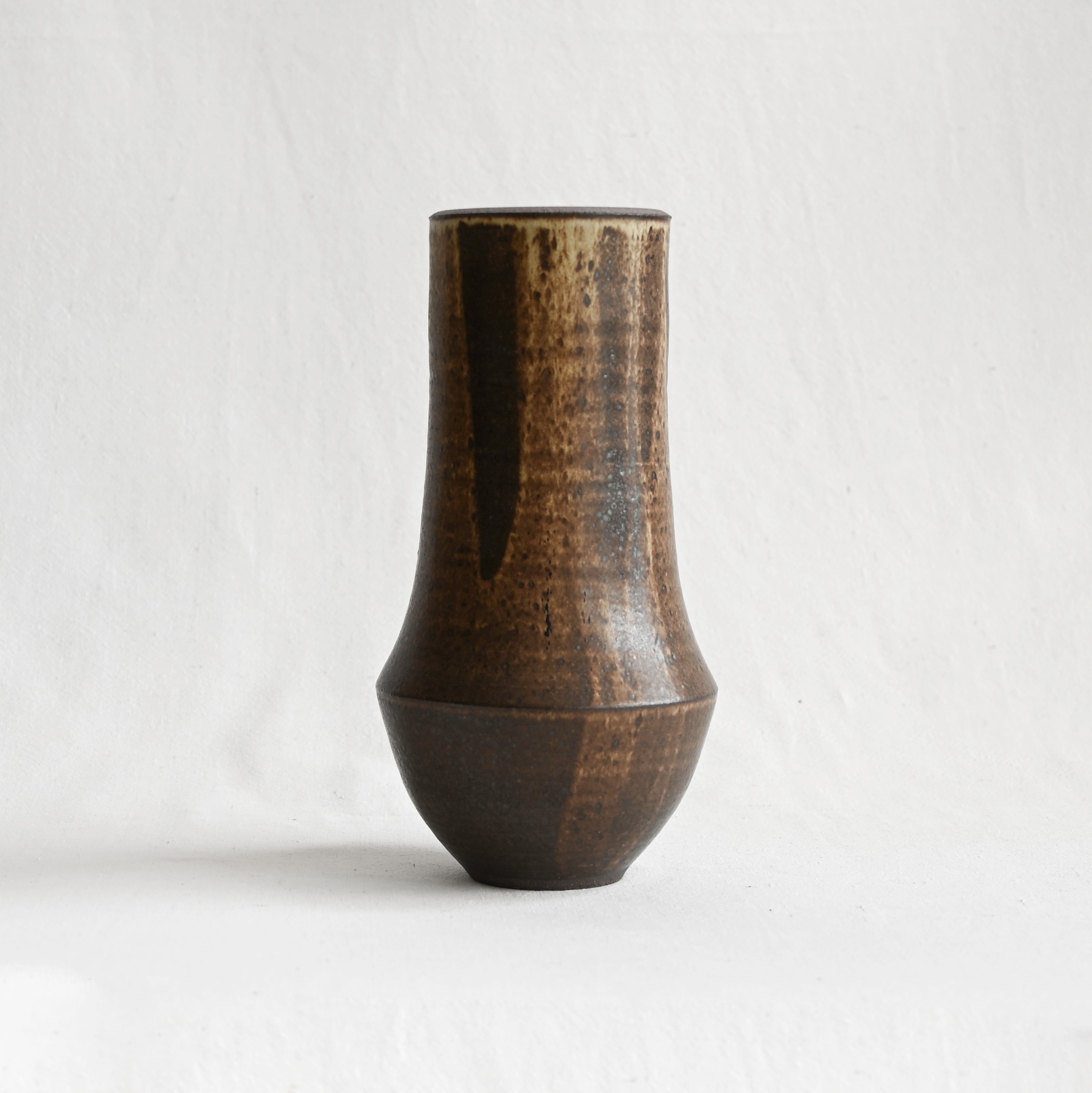 A modern take on a traditional form, the Pueblo Vase has an elegantly rounded shape at the base that transitions into an arched line toward the top. Handmade from stoneware in California, this piece is offered in a serene cerulean green glaze with bronze accents. Offered in a a rustic-modern brown glaze that shows off the movement in the glazing process. A one-of-a-kind piece, this vase was designed to become a functional, timeless work of art.