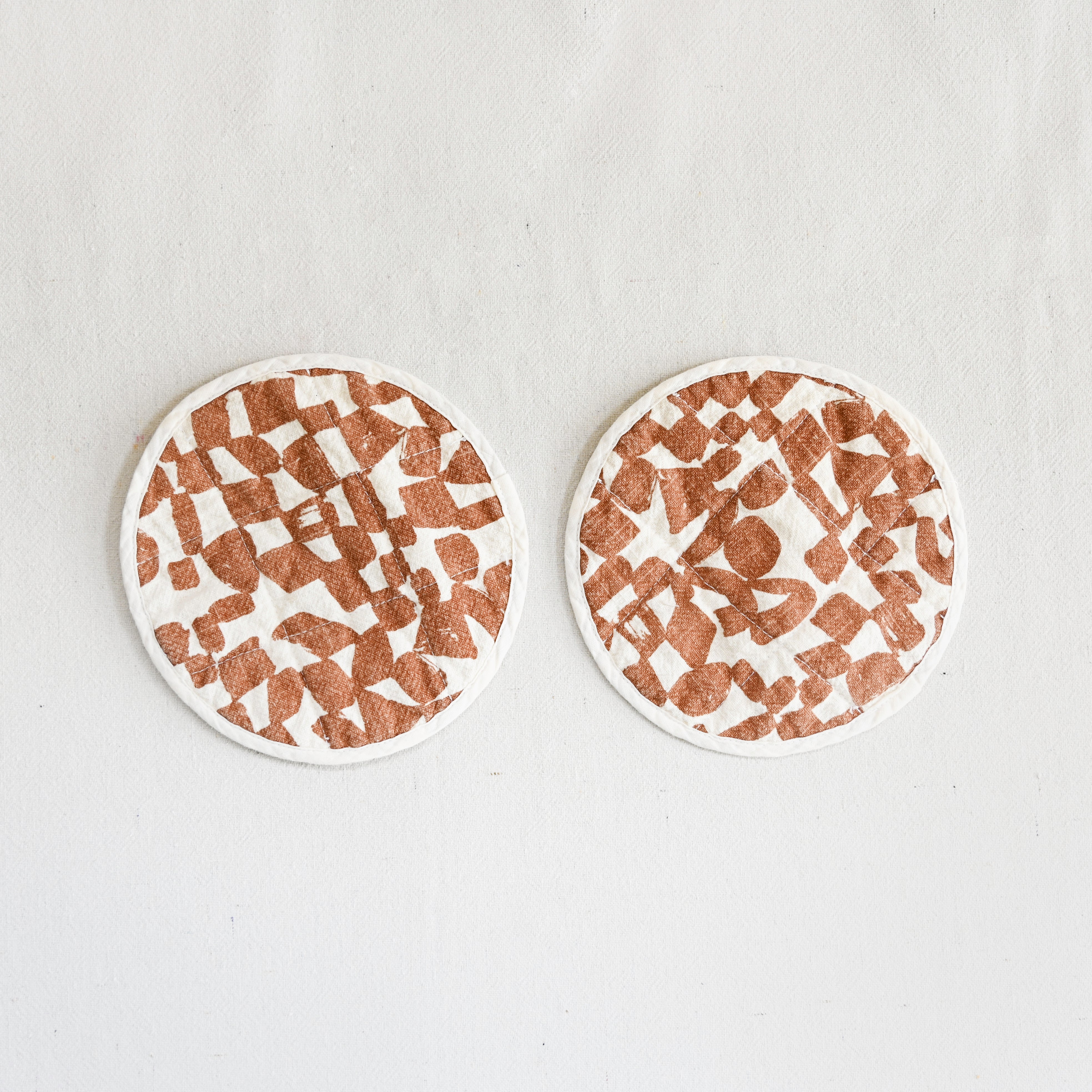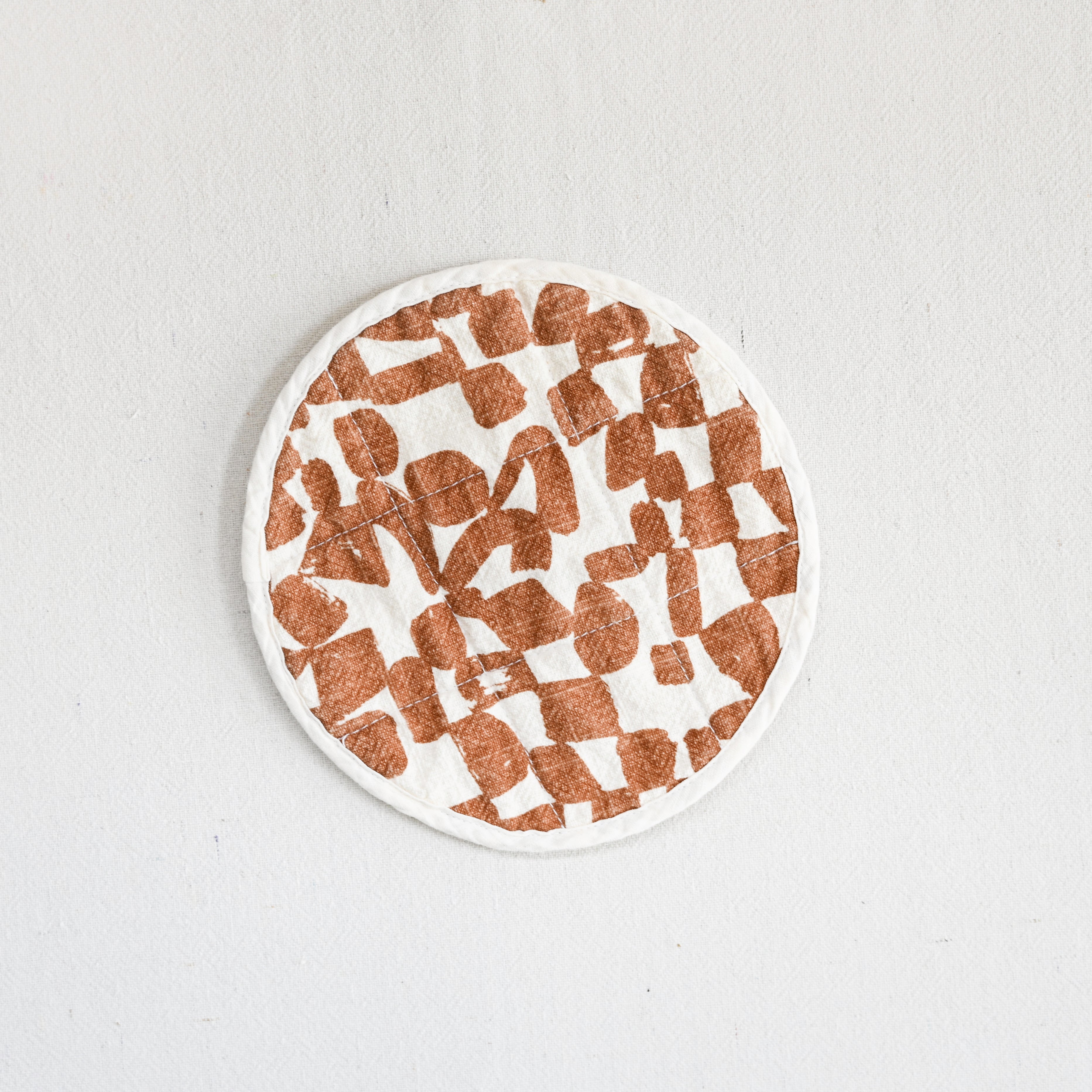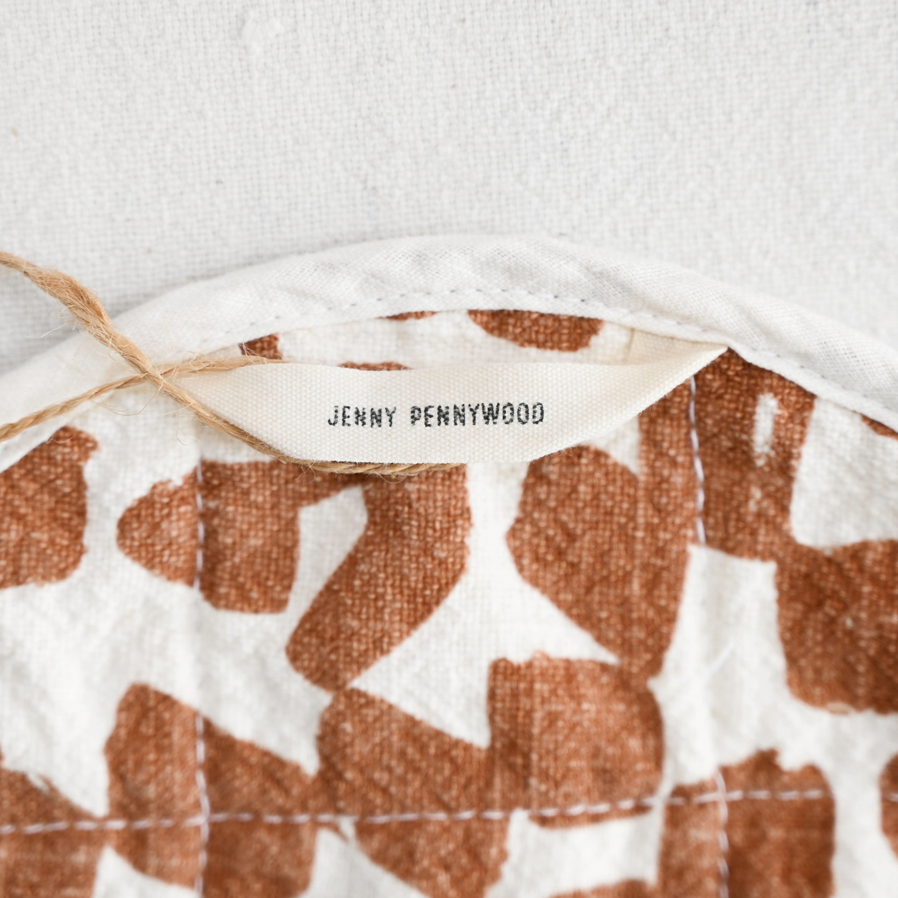 Jenny Pennywood linen-cotton blend round potholder.  Circumference measures approximately 7.5” and has a handy tag that doubles as a loop for hanging.