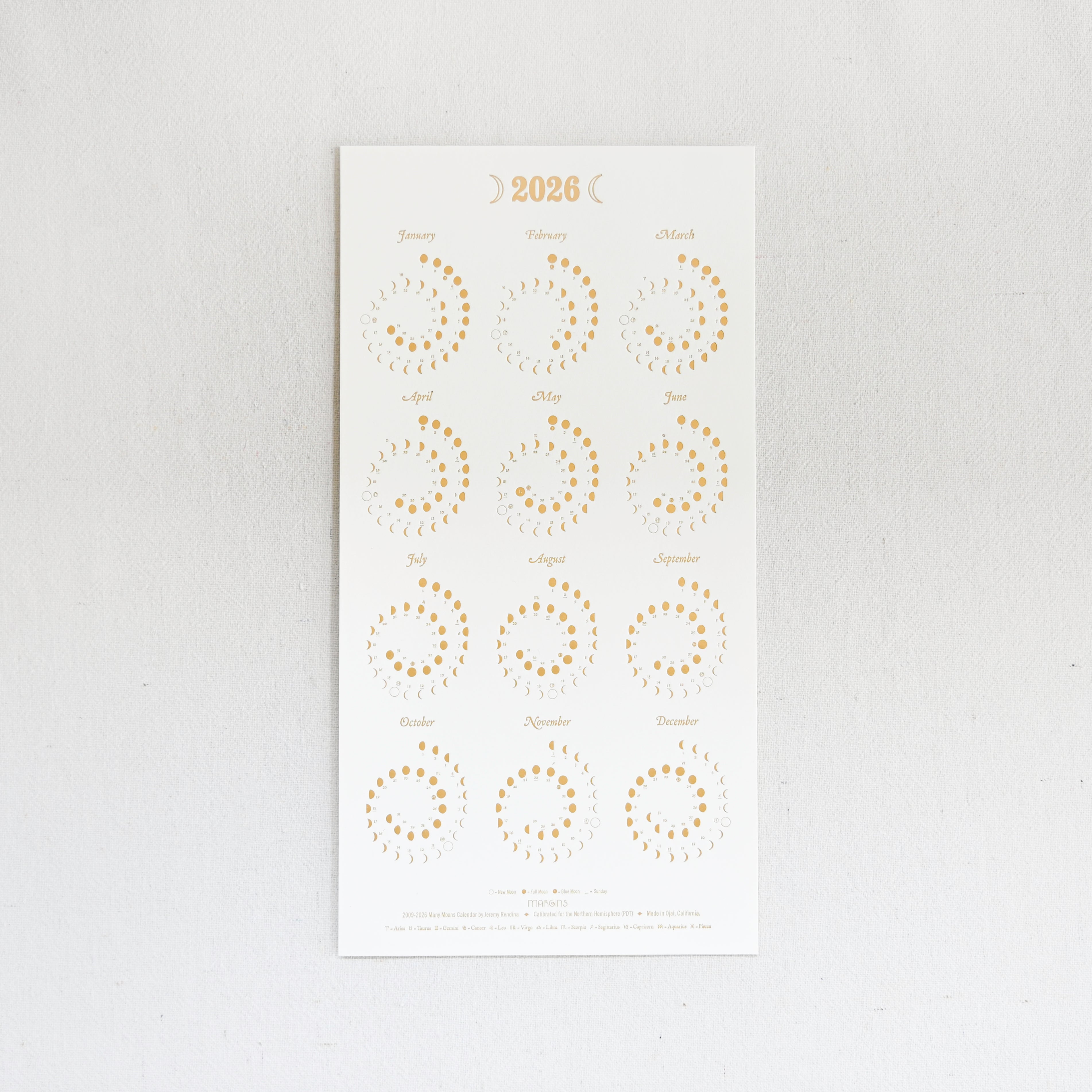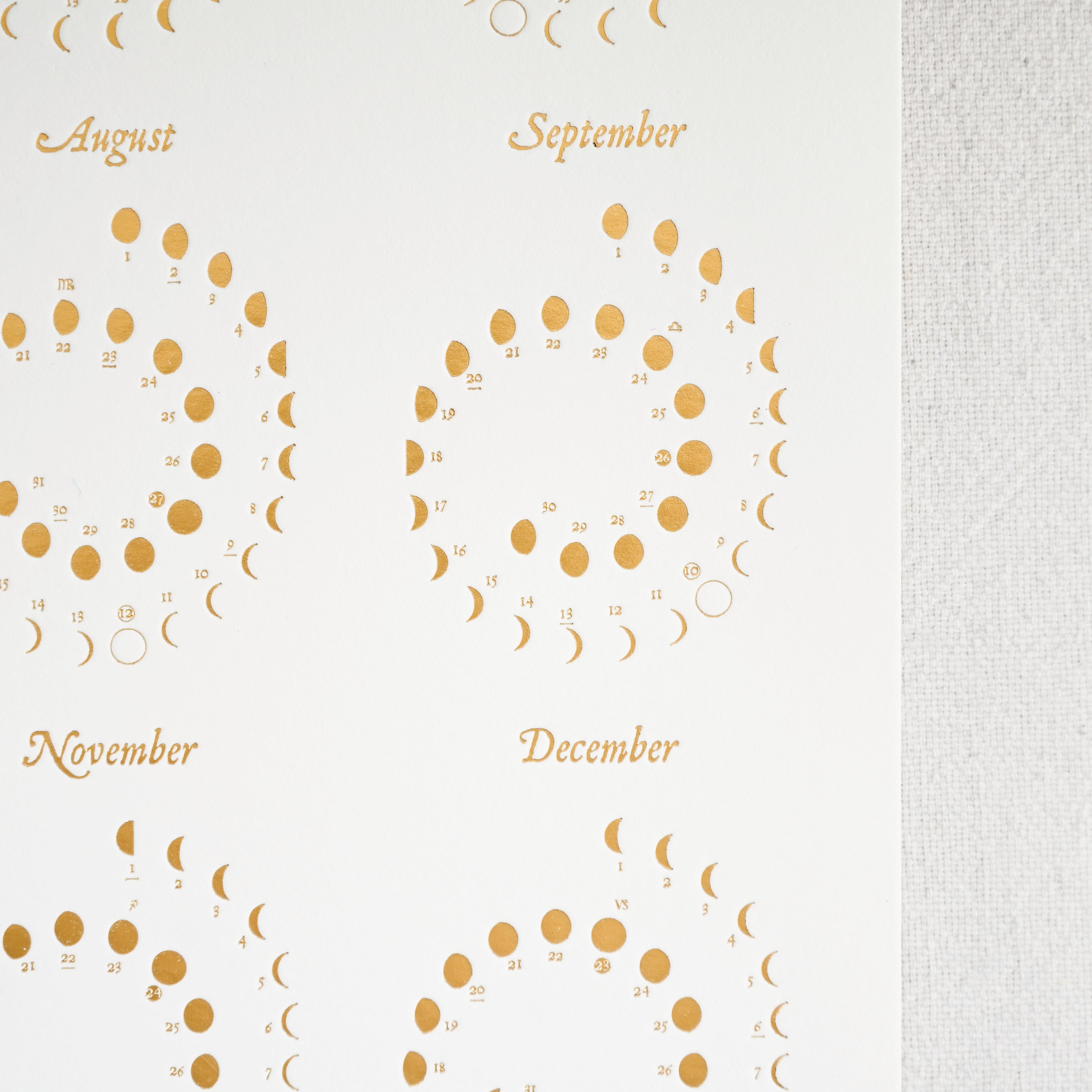 This broadside print is hand foiled on thick tree-free cotton paper.  The unique spiral design shows each phase of the moon daily. Full and new moon transitions are highlighted, with zodiac symbols listed. Let the moon guide you!