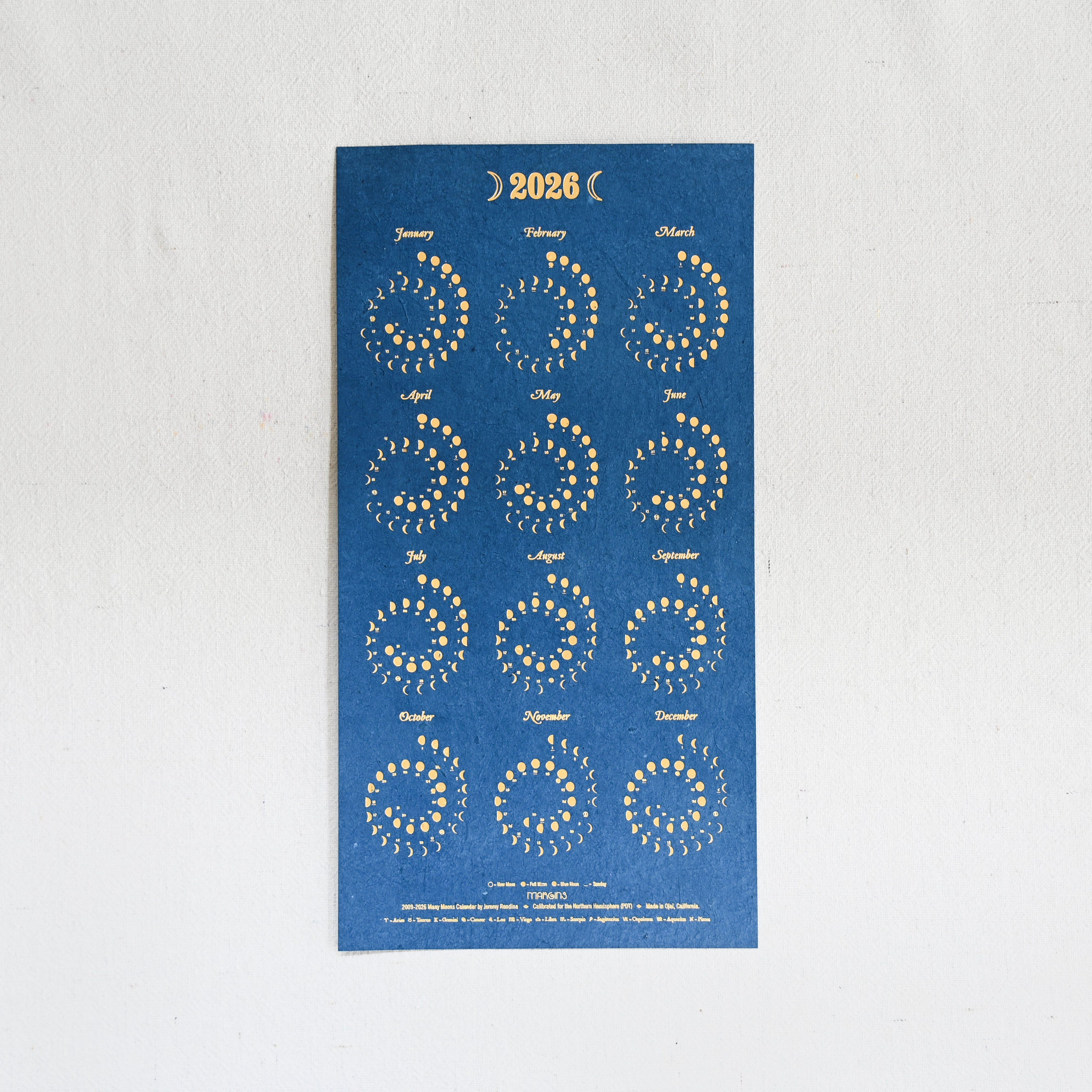 Each calendar is hand letterpressed on recycled paper embedded with wildflower seeds. Track the phases of the moon during the year and then reuse the calendar in the springtime.