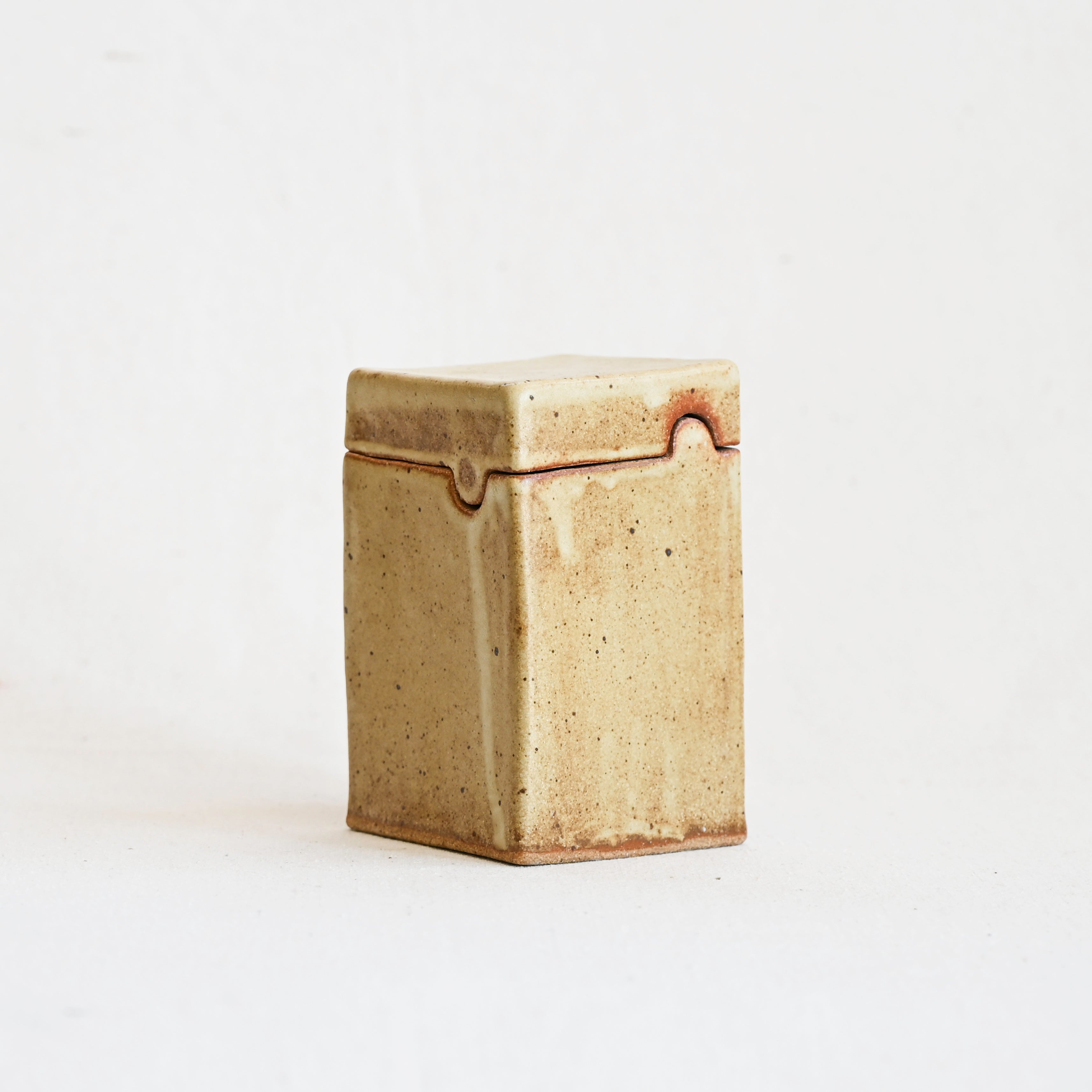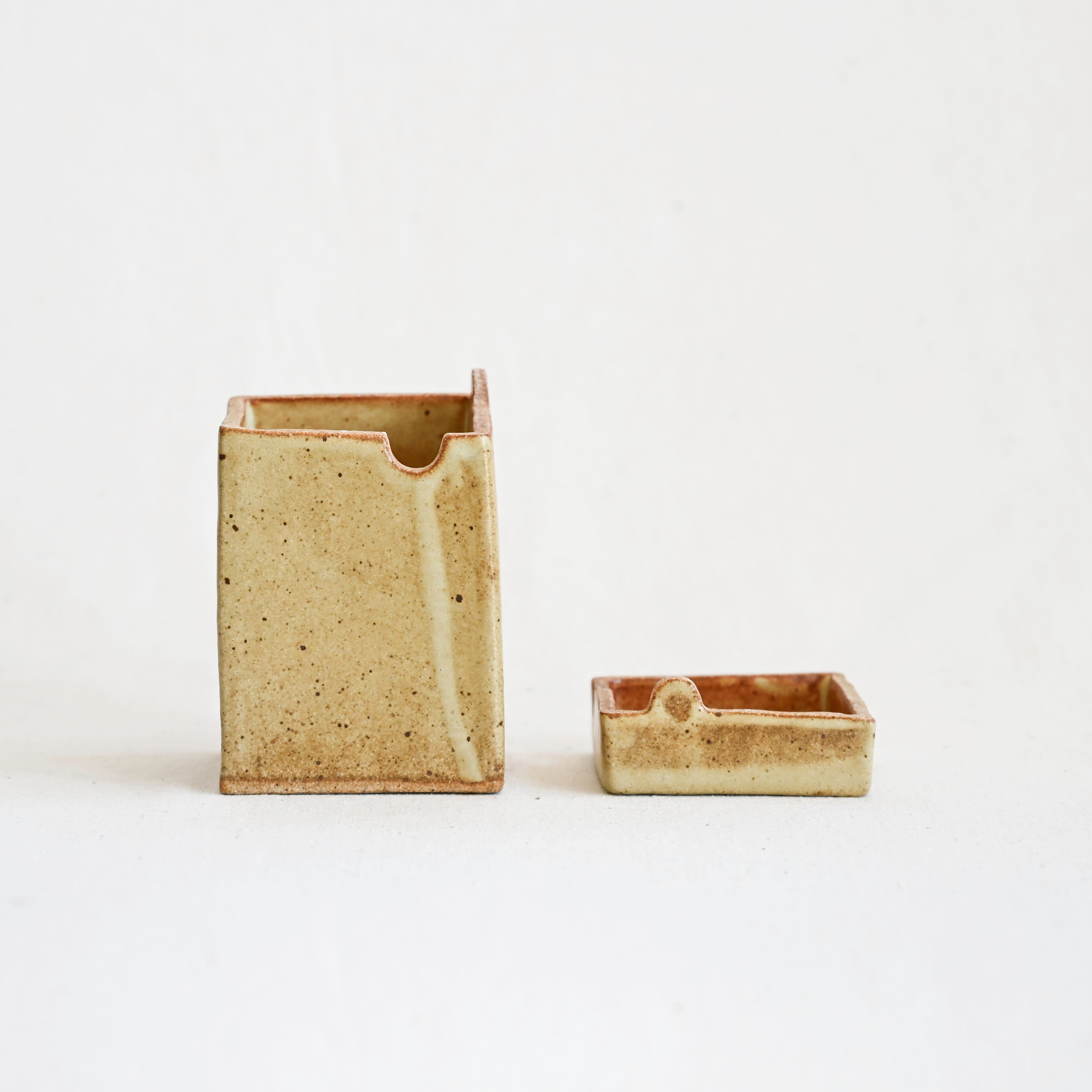 This ceramic handcrafted stash box features a unique puzzle-like closure.  Simple yet refined, its organic glaze gives it a quiet elegance.  Perfect for storing small items or displaying as a minimalist accent.